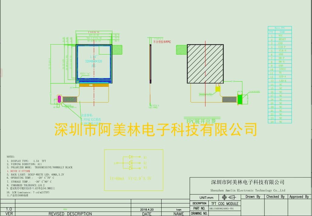 | 视角 | :IPS全视角 | 产品型号 | :AML154BS9624083-V01 |